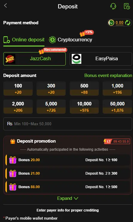 - Choose deposit and select EasyPaisa, JazzCash, or bank transfer.
